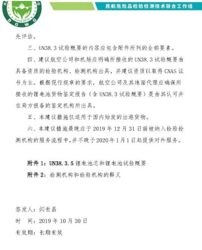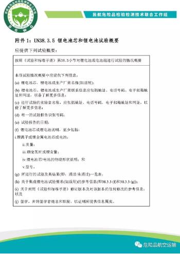 2019-2020版國(guó)際民航組織《危險(xiǎn)物品安全航空運(yùn)輸技術(shù)細(xì)則》規(guī)定,2003年6月30日以后生產(chǎn)的鋰電池芯或者鋰電池的制造商和隨后的銷(xiāo)售商必須提供聯(lián)合國(guó)《試驗(yàn)和標(biāo)準(zhǔn)手冊(cè)》第三部分第38.3小節(jié)第38.3.5段規(guī)定的試驗(yàn)概要(以下簡(jiǎn)稱(chēng)UN38.3試驗(yàn)概要)。