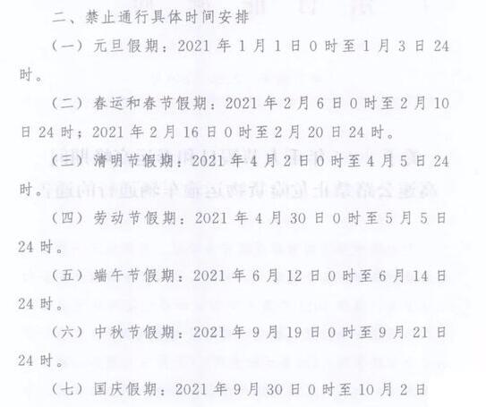 元旦節(jié)、春節(jié)、清明節(jié)、勞動節(jié)、端午節(jié)、中秋節(jié)、國慶節(jié)假日期間,全天禁止物品運輸車在高速公路通行;供應(yīng)自來水生產(chǎn)用的液氯運輸車輛,燃油、天然氣運輸車輛0時至6時禁止通行,其他時段不受限制。