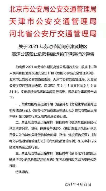 為確保2021年五一勞動節(jié)期間高速公路通行安全,根據(jù)《中華人民共和國道路交通安全法》和《危險化學品安全管理條例》,4月23日,北京市公安局公安交通管理局、天津市公安交通管理局、河北省公安廳交通管理局發(fā)布《關(guān)于2021年勞動節(jié)期間京津冀地區(qū)高速公路禁止物品運輸車輛通行的通告》,通告決定,自2021年5月1日零時至5月5日24時,實施物品運輸車輛限行措施。