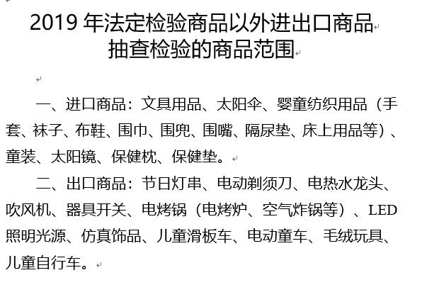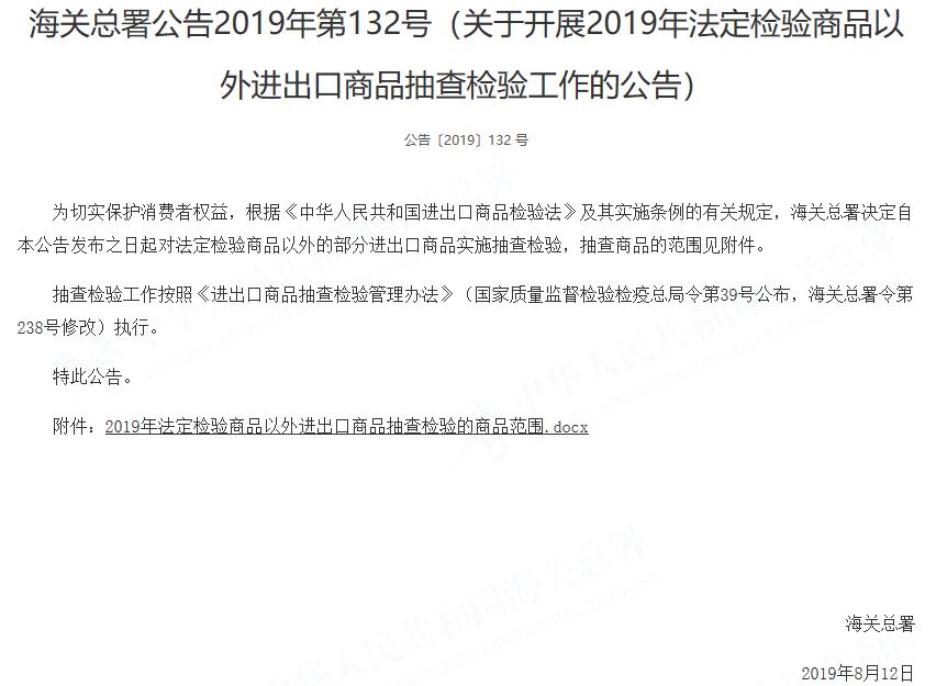 海關(guān)總署公告2019年第132號(關(guān)于開展2019年法定檢驗商品以外進出口商品抽查檢驗工作的公告)