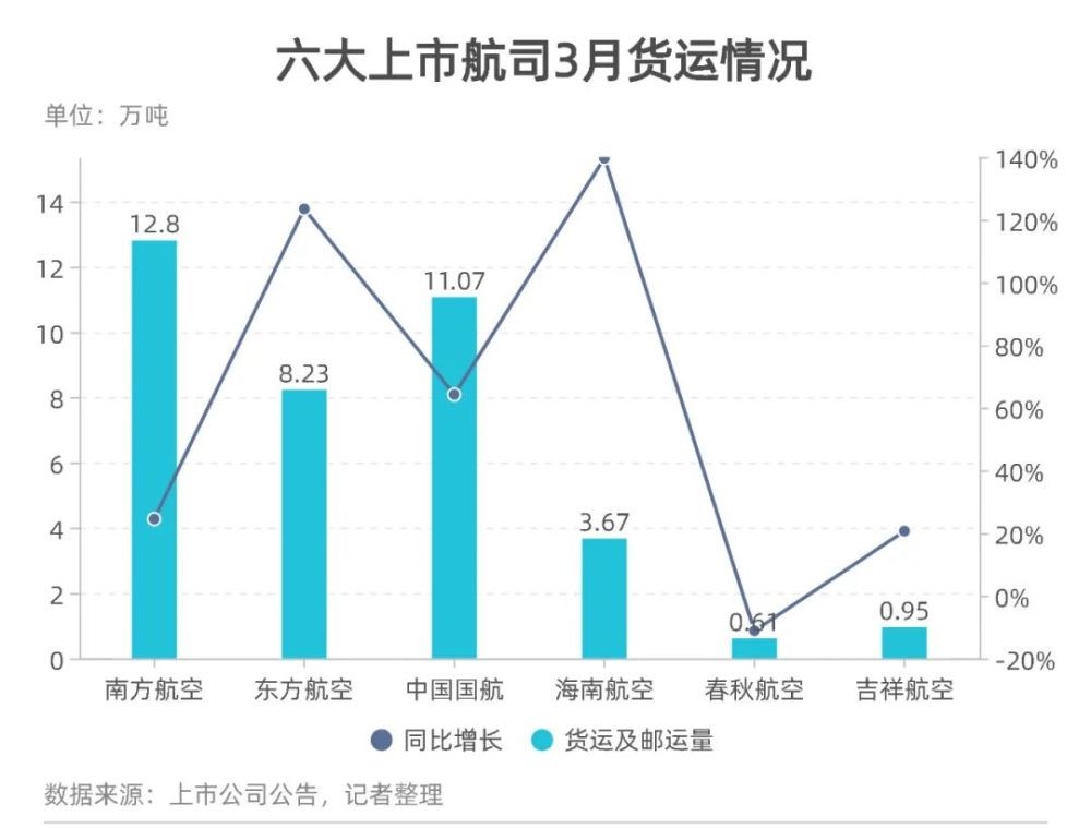 民航局?jǐn)?shù)據(jù)顯示,3月全民航的貨郵運(yùn)輸量為65.5萬噸,較疫情前的2019年同期增長(zhǎng)3.7%。