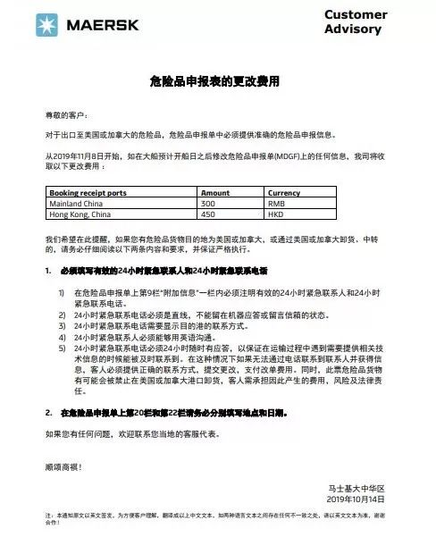 出口至美國或加拿大的危險品,危險品申報單中必須提供準確的危險品申報信息。從2019年11月8日開始,如在大船預(yù)計開船日之后修改危險品申報單(MDGF)上的任何信息,馬士基將收取更改費。