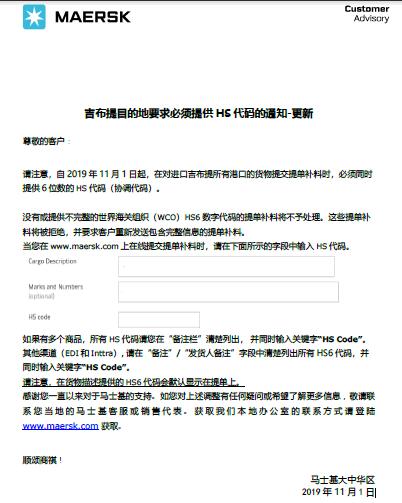 近日吉布提海關(guān)提出,自2019年11月1日起貨物進入吉布提所有港口均需要在提單上顯示HS代碼。MSK近日已經(jīng)發(fā)出通知。